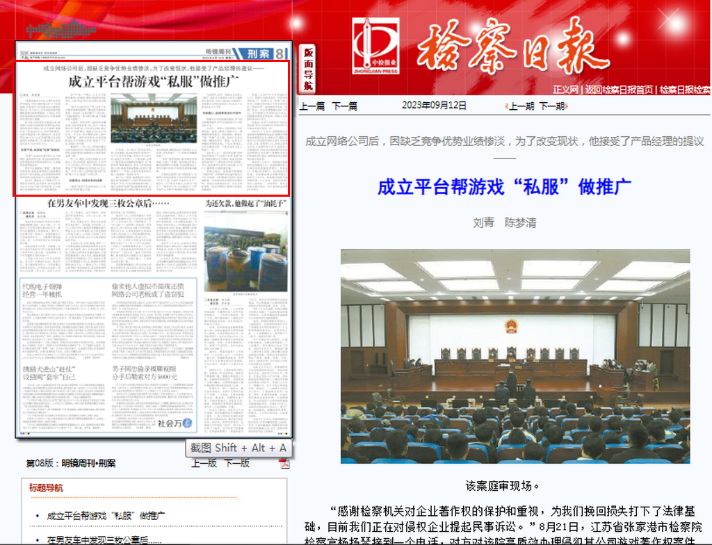 “感谢检察机关对企业著作权的保护和重视,为我们挽回损失打下了法律基础,目前我们正在对侵权企业提起民事诉讼。”8月21日,江苏省张家港市检察院检察官杨扬琴接到一个电话,对方对该院高质效办理侵犯其公司游戏著作权案件表示感谢。