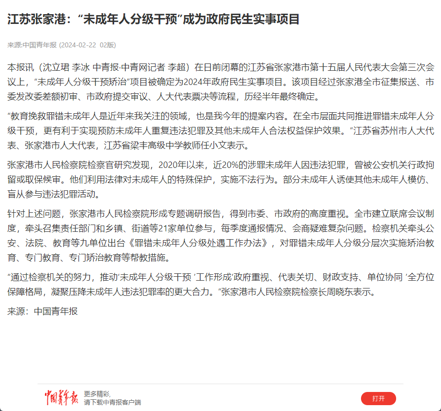 在日前闭幕的江苏省张家港市第十五届人民代表大会第三次会议上,“未成年人分级干预矫治”项目被确定为2024年政府民生实事项目。该项目经过张家港全市征集报送、市委发改委差额初审、市政府提交审议、人大代表票决等流程,历经半年最终确定。