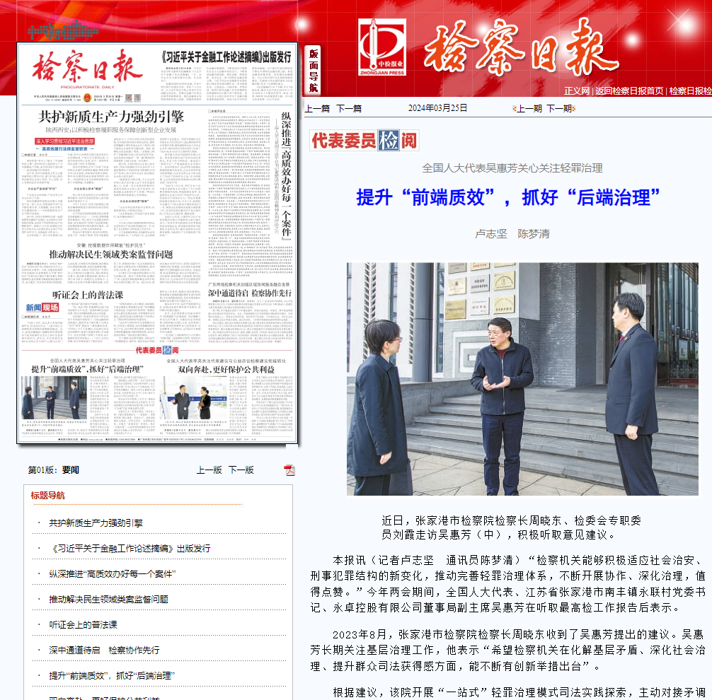 本报讯(记者卢志坚通讯员陈梦清)“检察机关能够积极适应社会治安、刑事犯罪结构的新变化,推动完善轻罪治理体系,不断开展协作、深化治理,值得点赞。”今年两会期间,全国人大代表、江苏省张家港市南丰镇永联村党委书记、永卓控股有限公司董事局副主席吴惠芳在听取最高检工作报告后表示。
